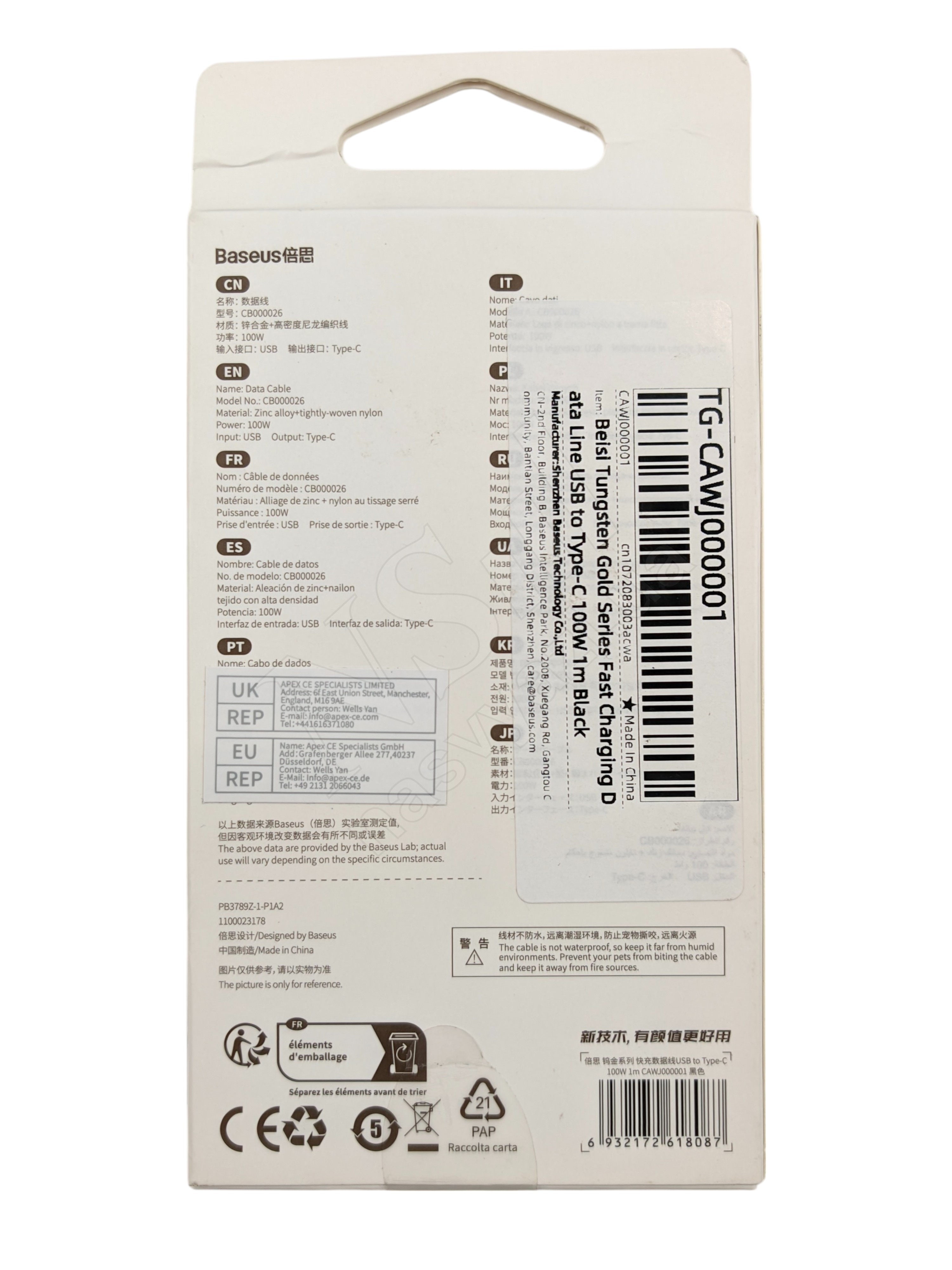 Кабель USB - Type-C Baseus TG-CAWJ000001 100W 1м черный