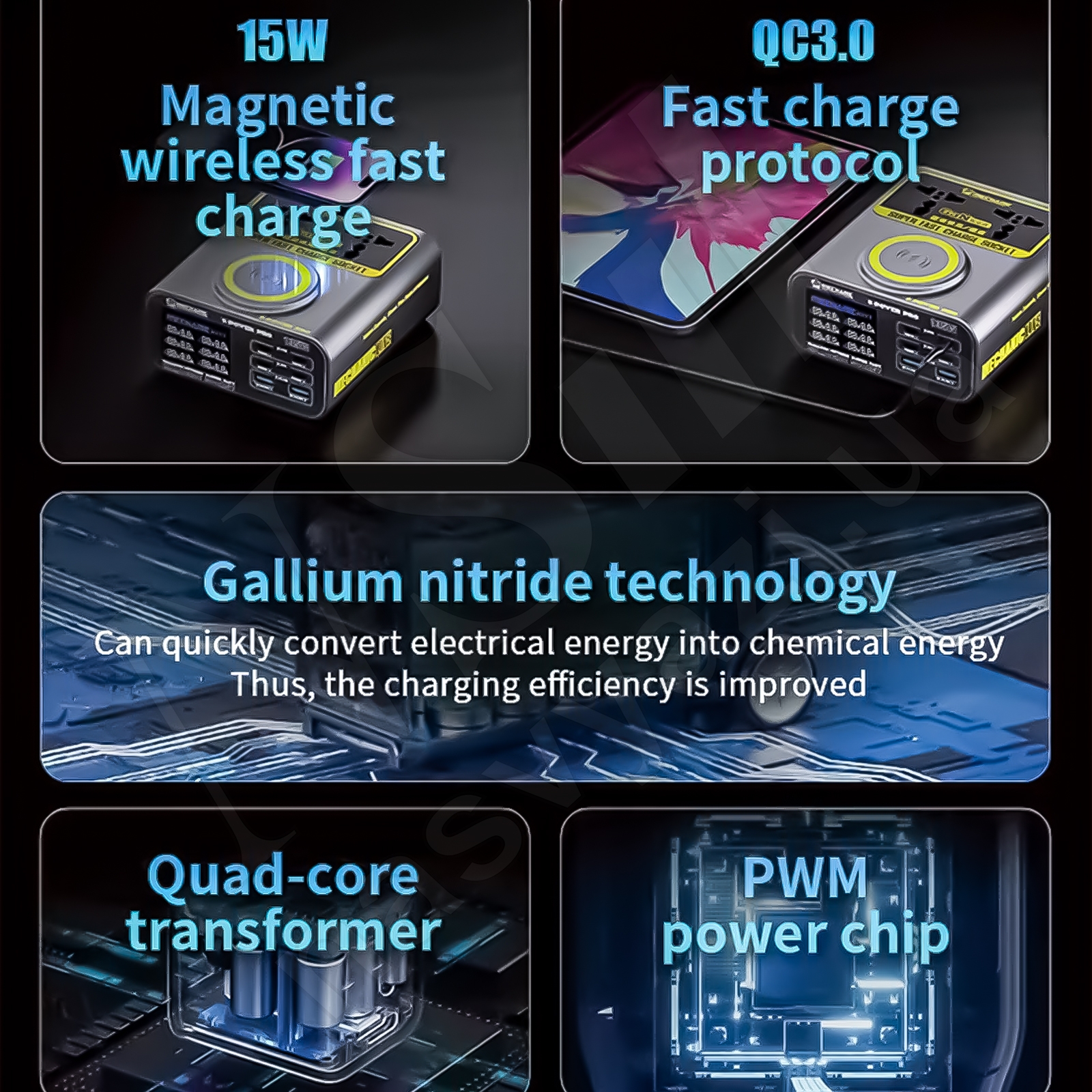 Нитрид галлия (GaN): ускоряет преобразование энергии, увеличивая скорость зарядки.