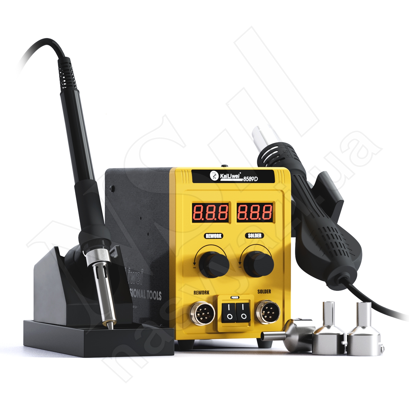 Характеристики Паяльная станция KAILIWEI 8589D (700W) турбинная (фен 100-500°С и паяльник 180-500°С)